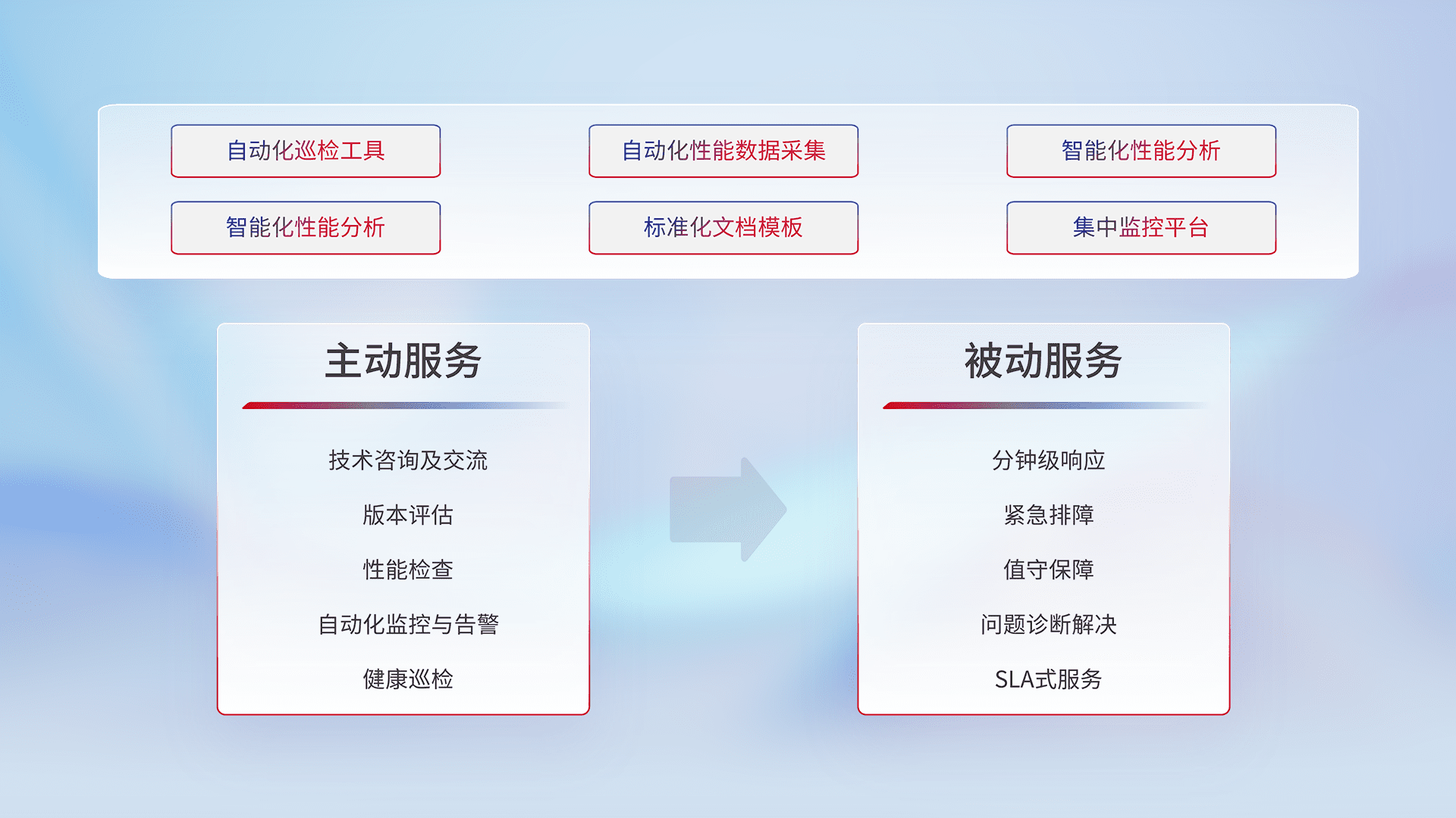 智能化工具和标准化文档,,,保障服务质量,,,提供主动服务(包含技术咨询、、、版本评估、、、性能检查、、自动化监控与告警、、健康巡检)和被动服务包含(分钟级响应、、、、紧急排障、、、值守保障、、、、问题诊断解决、、、SLA服务)。。